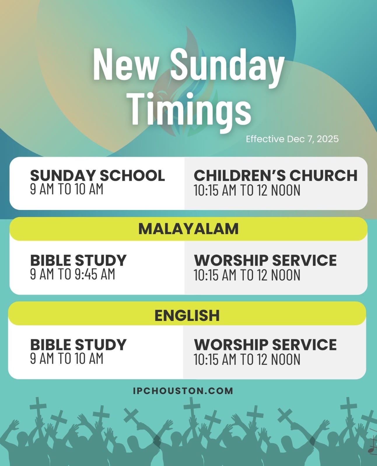 Malayalam | Sunday @ 10:15 AMEnglish | Sunday @ 10:15 AMHindi | Saturday @ 5:00 PMTamil | Saturday @ 5:00 PMChildren's Church | Sunday @ 11:00 AM